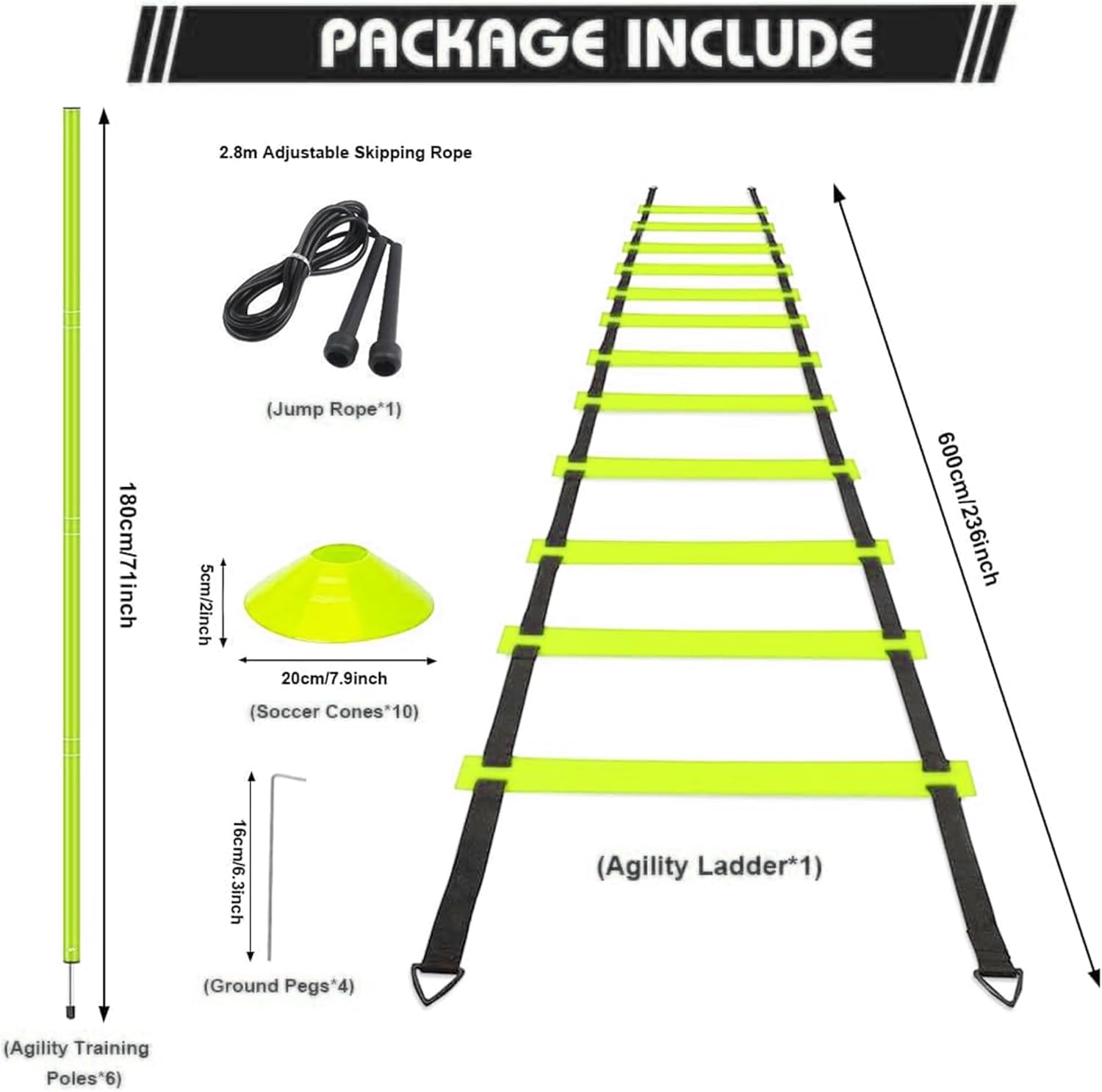 • 𝐀𝐥𝐥-𝐢𝐧-𝐎𝐧𝐞 𝐀𝐠𝐢𝐥𝐢𝐭𝐲 𝐓𝐫𝐚𝐢𝐧𝐢𝐧𝐠 𝐊𝐢𝐭 – This Platinum set includes everything you need for professional-style training: a 6m agility ladder for footwork drills, 6 slalom poles for directional speed, 10 space marker cones for agility zones, a 9ft jump rope for endurance, 4 ground pegs for stability, and a durable carry bag for easy transport and storage.